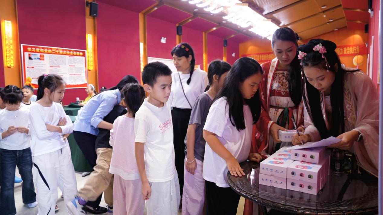上午9时,博物馆设有对诗区、灯谜游戏区与古风打卡区。观众们围绕“月”字展开对诗游戏。诗句络绎不绝,既有“明月几时有”的经典,也有孩子们稚嫩却真诚的创作。灯谜区悬挂着精心设计的谜题,家长与孩子共同动脑,猜中者喜获专属徽章。在打卡墙下,观众与NPC互动合影,留下了一张张充满节日气息的温馨影像。三枚徽章集齐后,不少家庭高兴地兑换了博物馆准备的特色纪念品,脸上洋溢着收获的喜悦。
