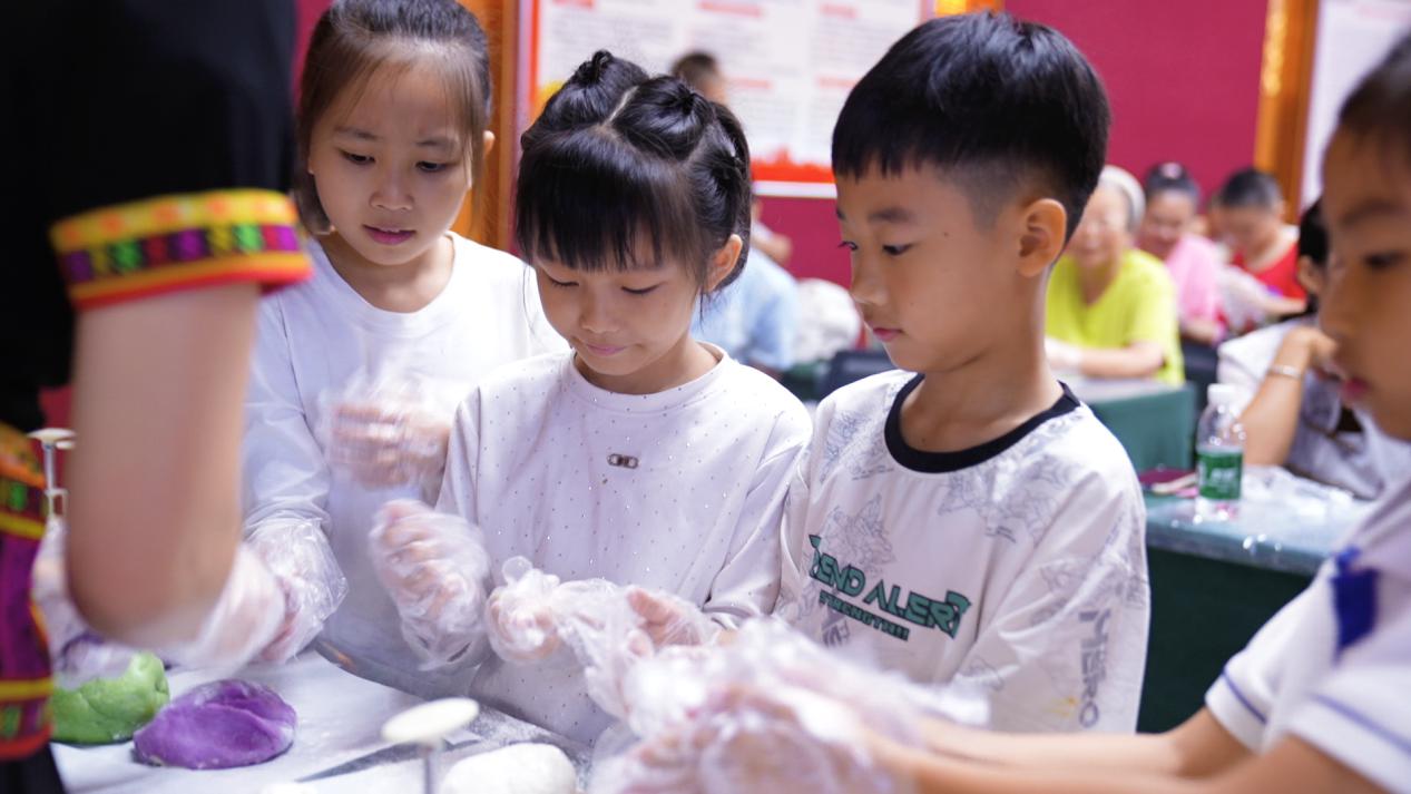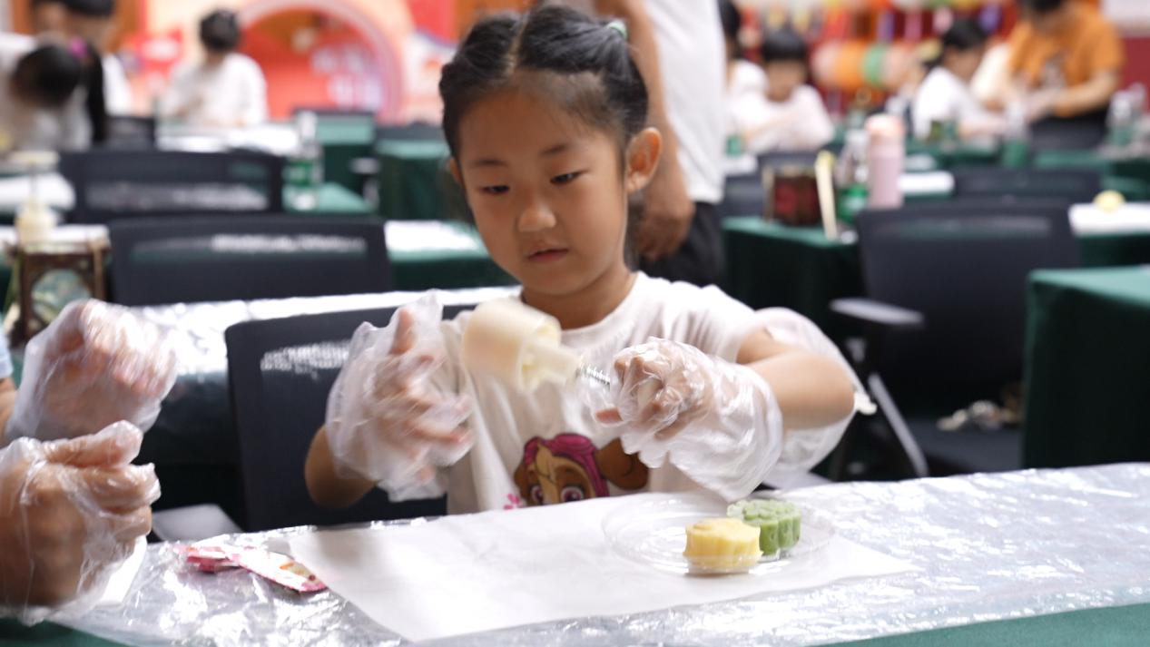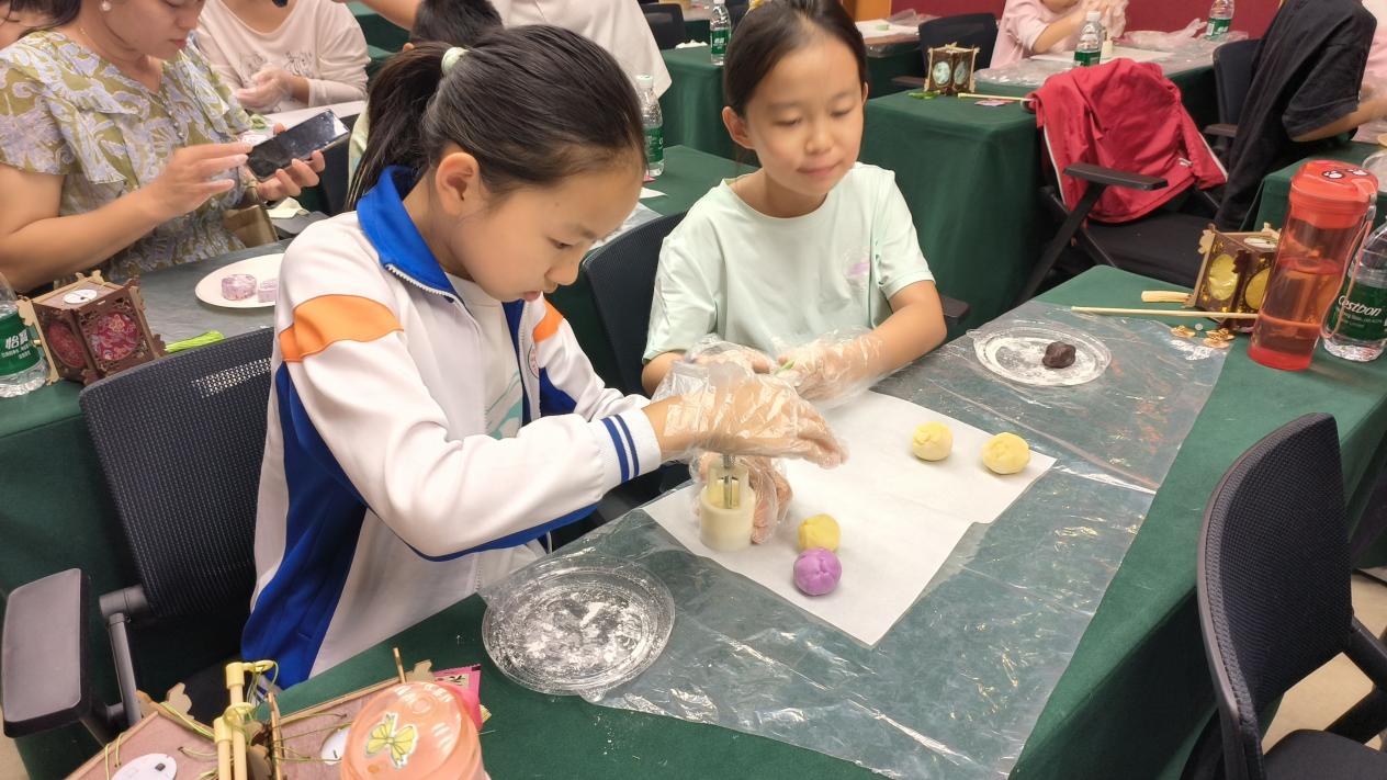 “手作月饼·品味中秋”工坊区飘来阵阵香甜。在老师的指导下,亲子家庭动手制作冰皮月饼。揉皮、包馅、压模……每一步都充满乐趣。不少家长表示,这是孩子第一次亲手制作月饼,不仅锻炼了动手能力,更真切地感受到中秋“团圆”的仪式感。