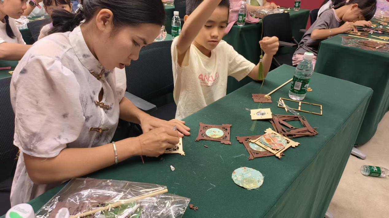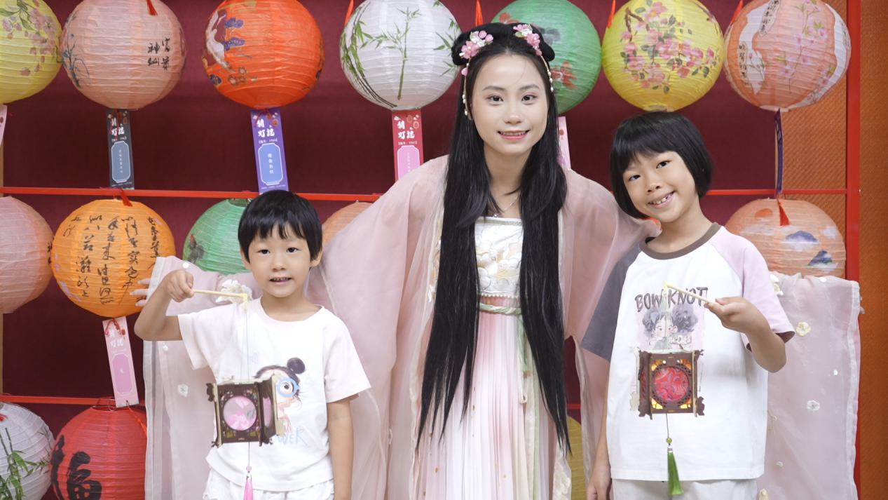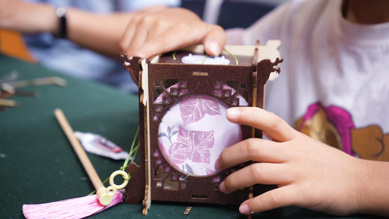 作为中秋的符号之一,宫灯制作工坊也备受青睐。老师首先介绍了宫灯的历史与文化寓意,随后带领大家制作简易版宫灯。裁剪、粘贴、穿线、点亮......一盏盏寓意团圆与光明的宫灯在手中逐渐成型。灯光亮起时,现场暖意融融,一盏盏宫灯,包含着观众们对家国团圆、生活美满的美好期盼。